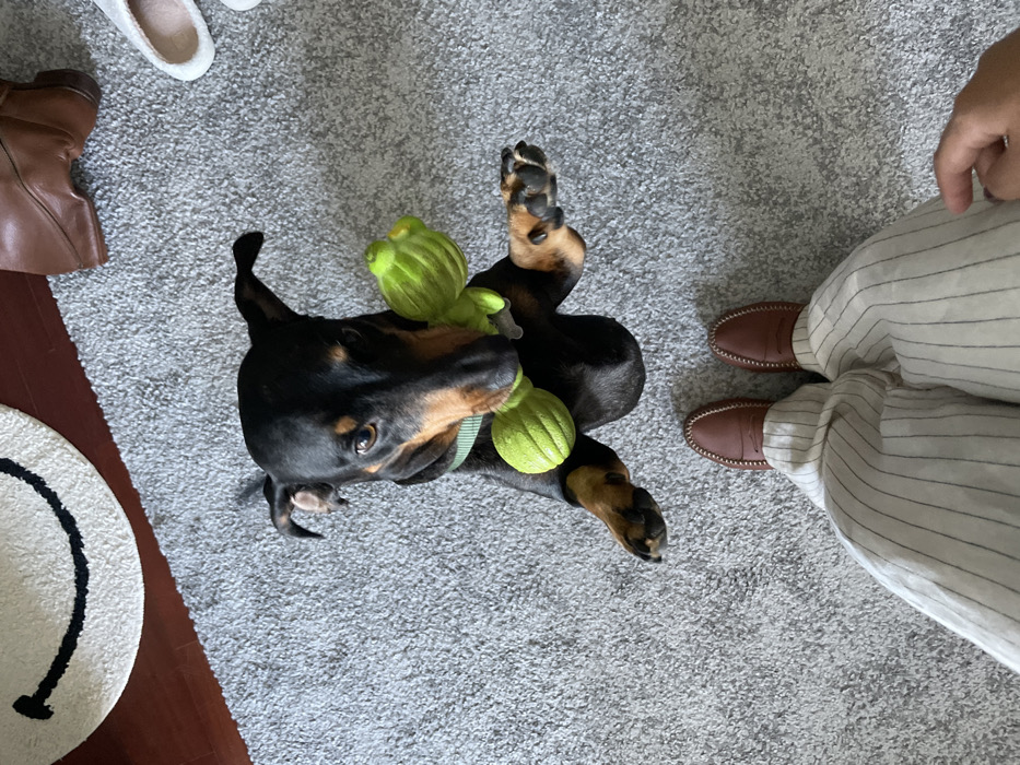 A high-angle indoor photograph depicts a black and tan dog, resembling a Miniature Pinscher or Dachshund, standing upright on its hind legs on a light gray carpet. The dog wears a green collar and holds a bright green, textured squeaky toy with two distinct bulbous sections in its mouth. Its front paws are raised, directed towards the viewer, and its gaze is fixed upwards towards the camera. In the foreground, the lower legs and feet of a person are visible. The person wears light-colored, vertically striped wide-leg trousers and brown loafer-style shoes featuring a visible white interior lining. A partial view of the person's right hand is present on the lower right edge of the frame. The background includes sections of a dark wooden floor, upon which rests a cream-colored circular rug with a black stylized smiley face design. Also visible on the wooden floor are a single brown leather boot and a single white slipper. The image provides no discernible information to specify its location within Porto, Portugal.