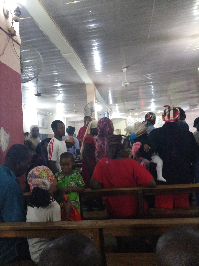 Inside what appears to be a church or gathering hall, a diverse group of people are congregated