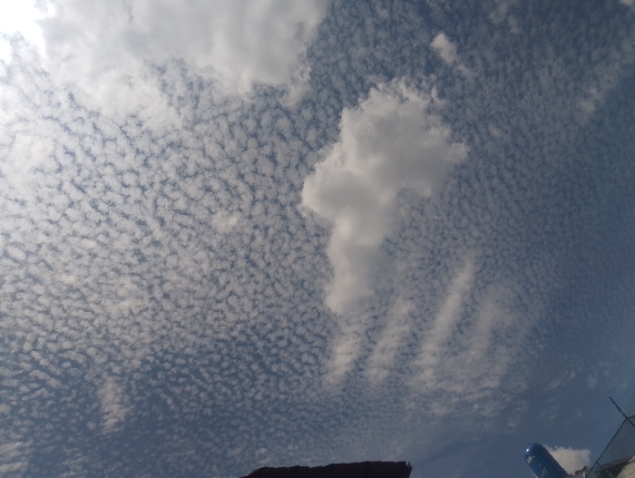 The image displays an upward-facing view of a daytime sky, dominated by an extensive formation of altocumulus stratiformis radiatus clouds, characterized by numerous small, rounded cloudlets arranged in parallel bands across the majority of the blue background. A more substantial, irregularly shaped cumulus cloud mass is situated in the mid-left of the frame, with additional elongated cloud formations visible towards the mid-right. At the bottom-left edge, a dark, irregular silhouette, consistent with the top of a man-made structure, is partially visible. At the bottom-right, a section of a bright blue, curved, and likely cylindrical object, possibly a tank or utility fixture, is present. Adjacent to the blue object, a dark, open-mesh structure, resembling a fence or netting, is discernible against the sky. No individuals, explicit actions, or direct interactions are depicted. The image does not contain sufficient discernible landmarks to determine a precise location within Caracas, Venezuela.