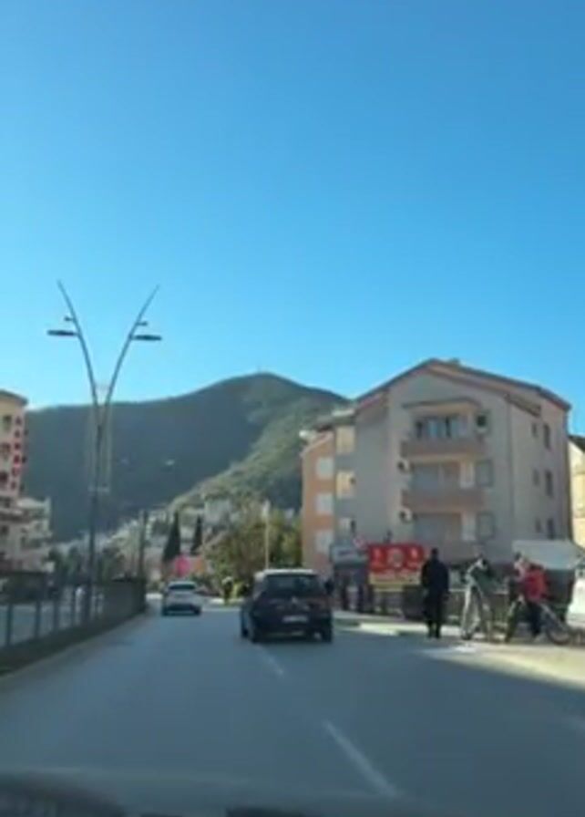 A car drives along a paved road with a white dividing line, on a bright, sunny day. Buildings line the right side of the street, with a "Good FOOD" sign visible on one of them. Pedestrians walk on the sidewalk. A mountain covered in greenery is visible in the background under a clear blue sky. Street lights with a modern, curved design are positioned along the road. Two other cars are visible on the road ahead. The video is shot from the perspective of the driver.