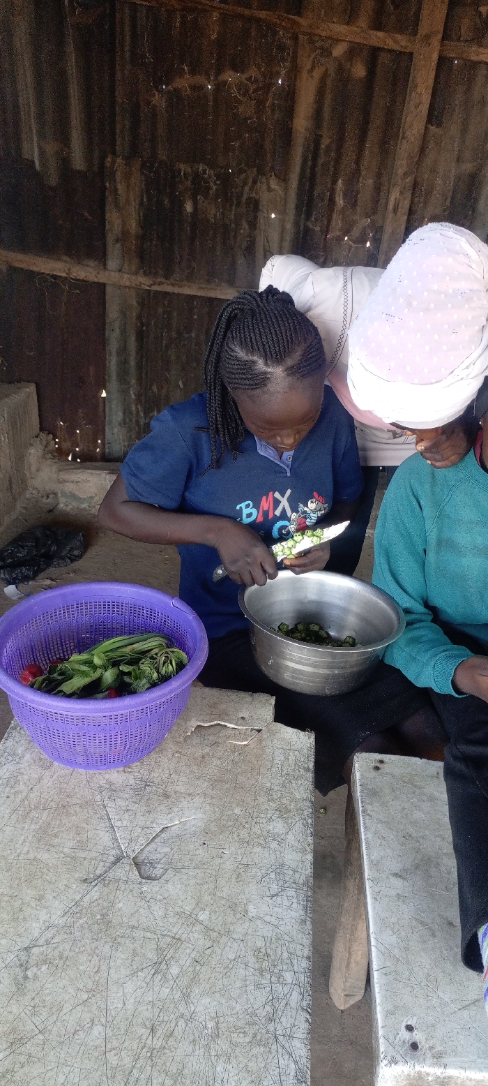This image depicts a food preparation scene occurring in a rustic, semi-enclosed structure in Kachia, Nigeria. **People:** * A young female, likely a child or adolescent, with dark skin and braided hair pulled back, occupies the central foreground. She wears a navy blue short-sleeved shirt with "BMX" and a cartoon character graphic on the front. She is actively engaged in chopping small green pods (identified as okra) with a silver-bladed knife, holding the pod in her left hand and the knife in her right. * An older female, partially visible on the right, wears a light-colored, possibly white, head covering with a polka-dot pattern and a teal long-sleeved top. Her head is bowed, and she appears to be observing the young female's activity, positioned closely beside her. * A third individual is partially visible in the upper right background, wearing a white garment, standing or sitting behind the older female. **Objects:** * A silver metal bowl, resting on the lap of the young female, contains numerous chopped green pods. * A purple plastic basket, positioned on a light-colored, heavily scratched, and worn surface to the left, holds green leafy vegetables and two red, bell-pepper-like vegetables. * The knife used by the young female has a dark handle and a silver-colored blade. * The work surface is a light-colored, possibly plastic or laminate, table or board, exhibiting numerous scratches and a central, star-shaped crack. * A black plastic bag is visible on the ground in the background to the left. **Environment:** * The background wall consists of vertically oriented, dark, corrugated metal sheeting, showing signs of wear, discoloration, and minor perforations through which small points of light are visible. * The floor appears to be an uneven, packed earthen or concrete surface. * The overall setting suggests a simple, functional space, likely an outdoor kitchen or food preparation area.