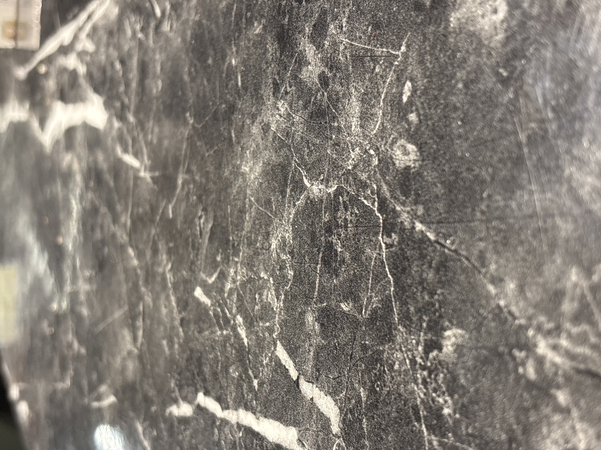 The scene depicts a close-up, low-angle perspective of a dark gray or black surface, characterized by intricate white and light gray veining patterns that resemble natural stone, such as marble or granite