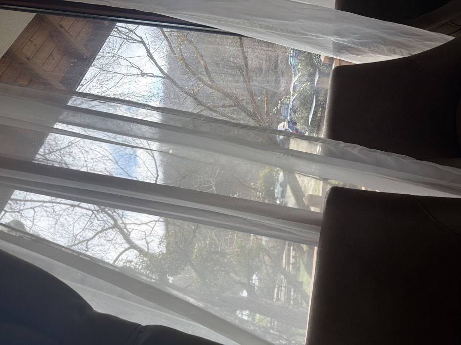 - "The image presents a view from an interior space looking out through a large window, partially covered by sheer white curtains" by FM-39vED3, licensed under CC BY 4.0
