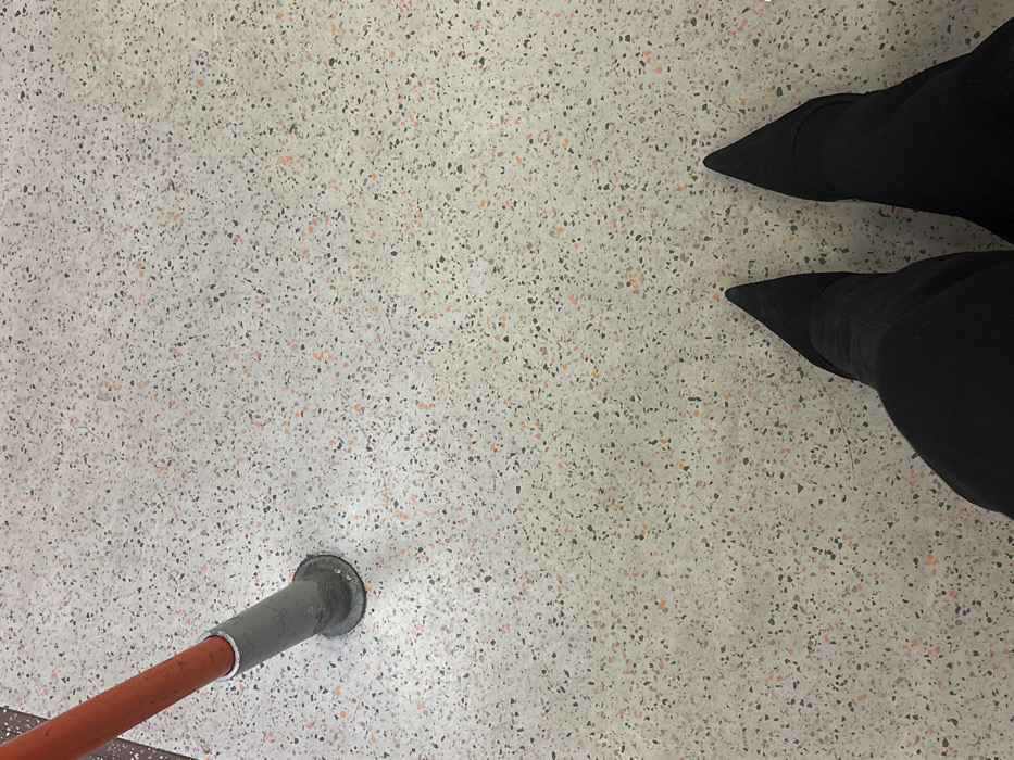 An overhead shot shows a speckled, light gray floor. To the lower left is a segment of a metal and orange pole with a circular base attached to the floor. To the right side are two black pointed shoes and black pants, suggesting a person is standing on the floor. The speckled pattern consists of tiny gray, black, and orange flecks. The flooring is clean and appears to be a terrazzo surface.