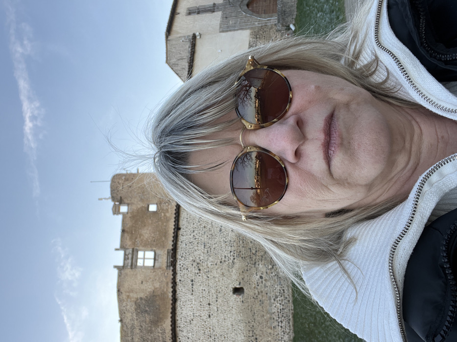 A middle-aged female subject is depicted in a close-up, front-facing selfie, occupying the lower portion of the frame. She has light blonde hair with bangs and several upward-jutting wisps at the crown. She wears round, tortoise-shell patterned sunglasses with brown-tinted lenses, obscuring her eyes. The reflections in the lenses show a bare tree landscape and an open area, suggesting a field or distant parking lot. Her attire consists of a white ribbed turtleneck sweater with a visible zipper, worn under a dark, possibly black, padded jacket. The background is an outdoor scene in Montrond-les-Bains, France, featuring historical architecture under a light blue sky with sparse white clouds. To the subject's left, a large, weathered stone castle or fortified building is visible, characterized by rough stone walls, small dark openings, and larger irregular window openings on its upper floors. A small tower and a flagpole (without a flag) are discernible on its upper structures. To the subject's right, a lighter-colored building with a sloped roof and a dark archway or door is present. A patch of light green grass is visible in the lower-left background, adjacent to the castle wall. The scene is illuminated by natural daylight.
