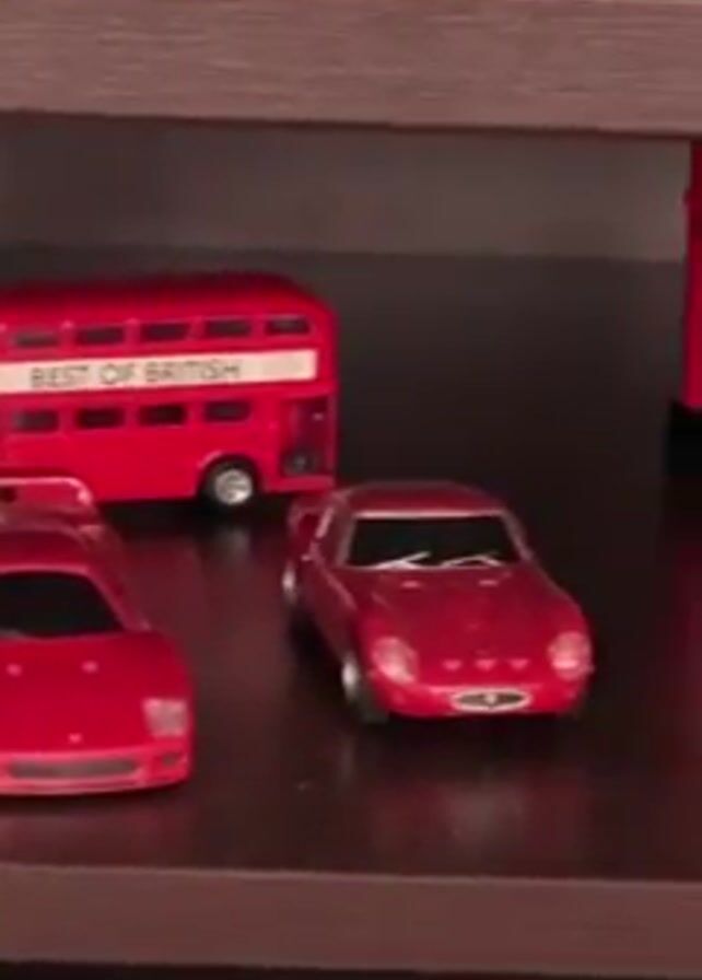 close-up view of a shelf displaying a collection of red toy cars and related British-themed objects. Starting from left to right, there's a red double-decker bus with "BEST OF BRITISH" written on it, a red toy Ferrari F40, a red toy Ferrari 250 GTO, a red toy British post box, a red toy Ferrari Formula 1 race car, a red toy Ferrari 430, a red toy Ferrari Enzo, and a red toy British telephone box. The shelf appears to be made of brown wood.