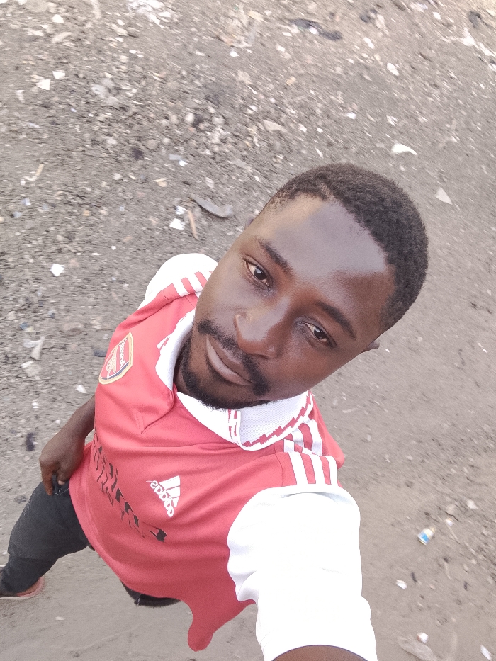 A man in a red and white soccer jersey takes a selfie. The jersey displays an Arsenal logo and the Adidas brand name. The background appears to be a dirt or gravel area with some scattered debris. The man has dark skin, short hair, and a trimmed beard. The camera angle is slightly tilted, looking up at his face.
