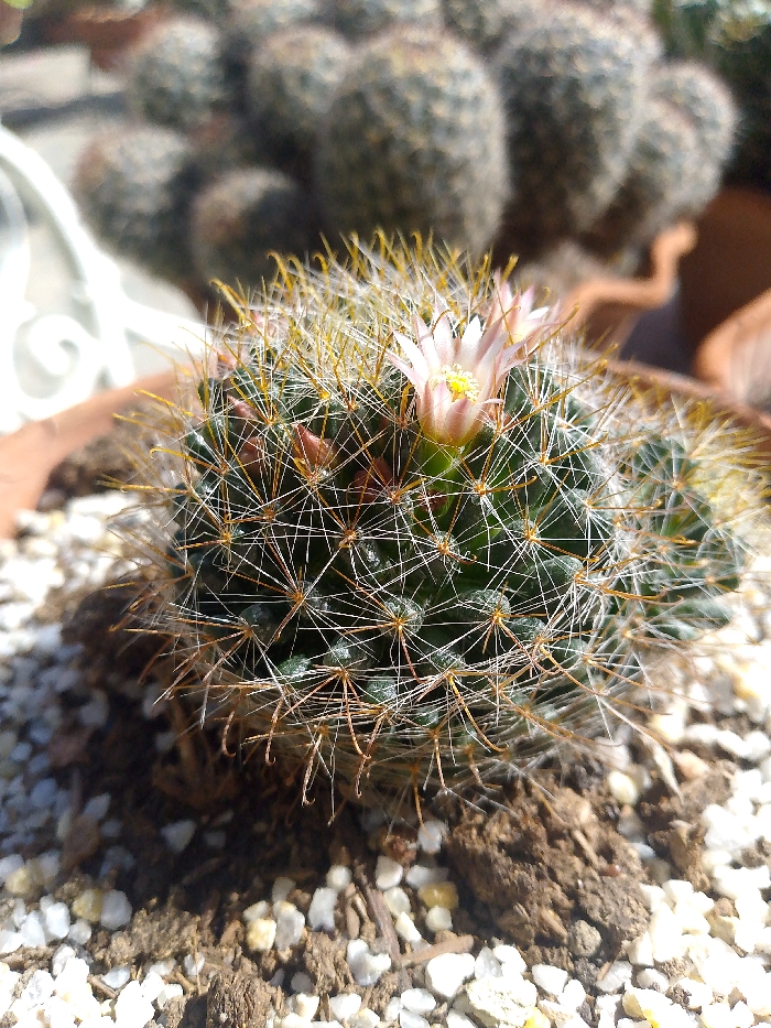A small, round cactus sits in a terracotta pot filled with soil and white pebbles. The cactus has a dense covering of thin, white spines and some feathery, golden ones near the top. Two pale pink flowers bloom from the top of the cactus. The background features a blurry collection of similar cacti in terracotta pots, with a glimpse of a white, ornamental object. The light is bright, casting subtle shadows on the soil.
