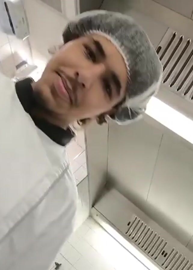 two men, both wearing white chef's coats and hairnets. One man holds a phone and films himself and his colleague. The first man smiles and makes a kissing face at the camera. The background appears to be a kitchen with stainless steel surfaces.