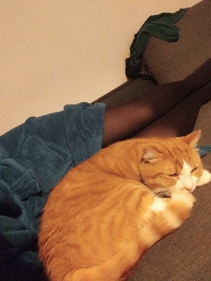 The image depicts an indoor residential scene in Strasbourg, France. An orange and white cat is curled in a sleeping posture on a dark gray upholstered surface, occupying the lower-center and right of the frame. The cat's eyes are closed, and it displays white markings on its muzzle, chest, and paws. To the left of and behind the cat, the legs of an individual are visible, covered in dark, sheer hosiery. One leg is partially covered by a teal blue terry cloth garment, consistent with a robe or blanket. The individual's legs are positioned in a relaxed, bent posture, indicating a reclining position on the upholstered furniture. In the upper right corner, a crumpled dark green fabric item, possibly clothing, is draped over an unseen portion of the furniture, with a fragment of dark patterned fabric visible beneath it. The background consists of a plain, light beige wall.