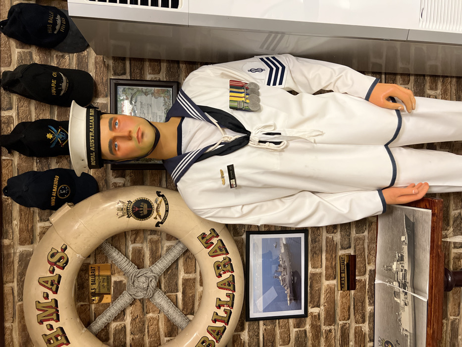The image displays a mannequin in a Royal Australian Navy sailor uniform with various naval memorabilia arranged on a brick wall