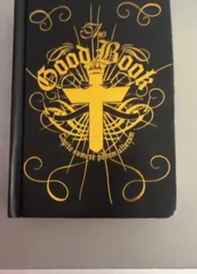book with a black cover and gold lettering and design. The book cover reads "The Good Book" and contains the image of a golden cross. The book is opened to reveal that the pages have been cut out to create a hollow space inside the book. Inside the hollow space is a silver flask.