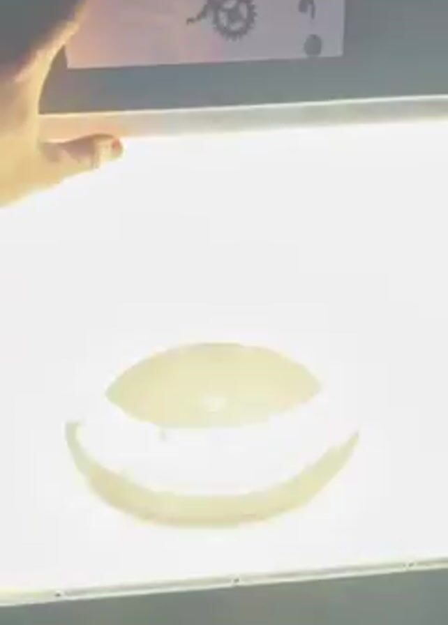 A hand presses a button on a machine with a small exhibit inside. The exhibit features a rotating gray disc with white figurines on it. The figurines are arranged in a circle and appear to be passing white heart-shaped objects to each other. The exhibit is enclosed in a clear case with a black frame, and the case is illuminated from within. The background music is audible.