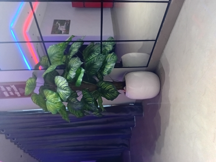 This interior image, taken in Idimu, Nigeria, presents a modern room with a light-colored tiled floor. To the left, dark grey curtains are drawn, partially revealing a dimly lit space. Centrally, a tall artificial plant with variegated green and light green leaves is potted in a glossy white, oval container. To the right of the plant, a large mirror with a black grid frame reflects parts of the room. The reflection displays a ceiling with red and blue LED strip lighting, a framed picture on a white wall depicting a white animal in water, and a portion of a red object, possibly an appliance, further to the right. On the wall behind the plant, a vertical dark red sign with white text reads, "With time an egg will walk."