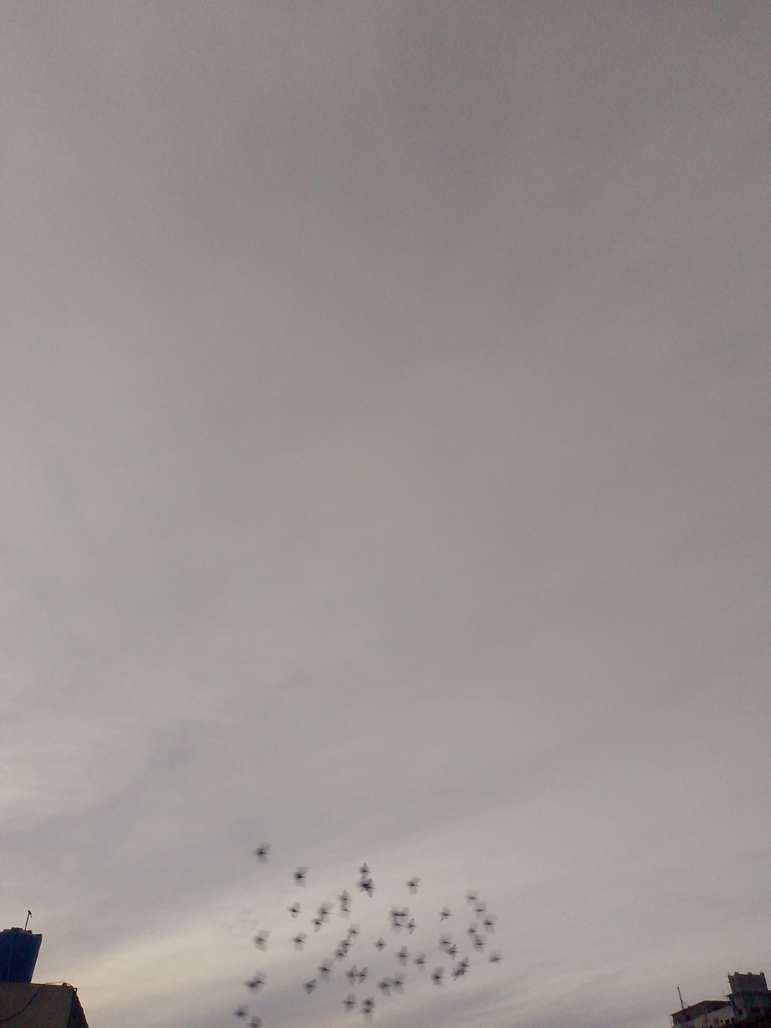 The image depicts an urban sky over Peshawar City Tehsil, Pakistan, under overcast conditions. The upper two-thirds of the frame consist primarily of a grey, cloudy sky. In the lower portion, a flock of approximately 30-40 birds is observed in flight, appearing as dark, blurred silhouettes against the lighter sky, indicating motion. On the lower left, the upper section of a building is visible, topped by a dark, rectangular water tank and a thin vertical antenna-like object. On the lower right, a portion of another building or structure, possibly with crenellated or decorative features, is partially visible. No people are discernible.