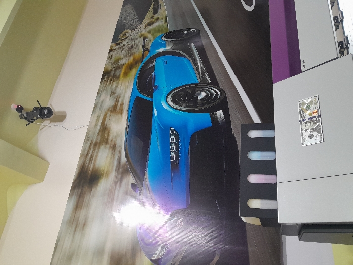 A large, vertically-oriented print dominates the scene, showcasing a blue sports car against a dynamic background suggesting movement