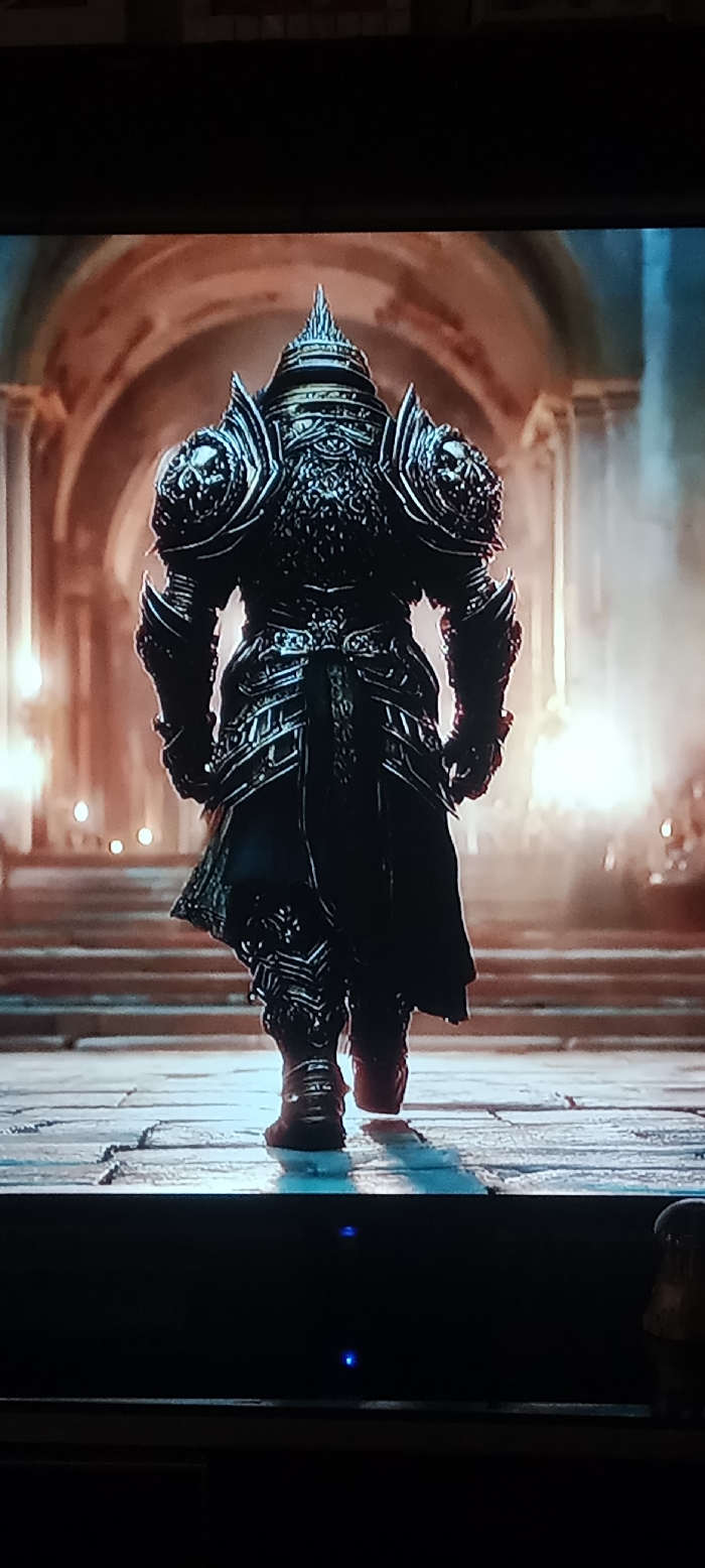 The image displays a digital rendering of a humanoid figure clad in elaborate, dark metallic fantasy-style armor, viewed from the rear, occupying the central frame. The armor is intricately detailed with ornate patterns, including spiked shoulder pads featuring skull-like motifs and a multi-tiered, spiked helmet. A dark fabric cape hangs from the figure's waist. The figure is depicted in motion, walking forward on a reflective, light-colored stone-paved floor, casting faint blue-tinted reflections. The environment is a grand, dimly lit interior space characterized by large arched structures and columns receding into the background. Bright, diffuse light sources are visible at the far end of the hall, creating a dramatic silhouette effect against the background. The image itself is a photograph of a screen, evidenced by the black letterboxing at the top and bottom, and two illuminated blue indicator lights on the lower bezel of the display device. This scene is a digital rendering, likely from a video game or film, and does not depict a physical location within Abuja, Nigeria.