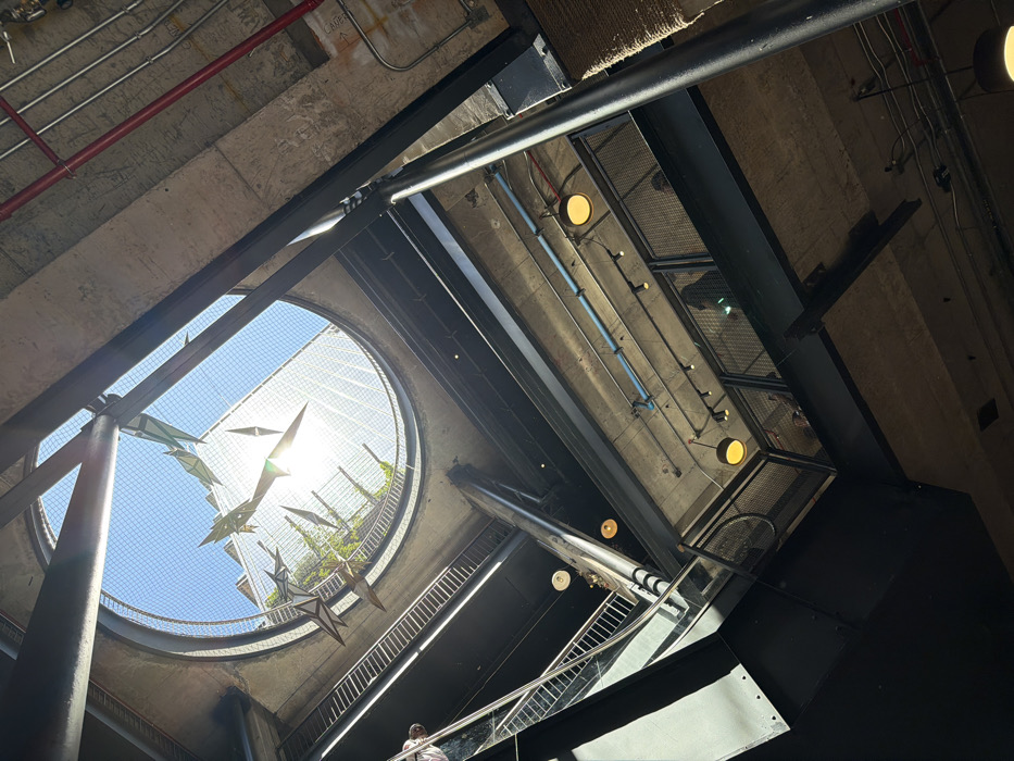 Looking upwards, the image captures an architectural space. A circular opening in the ceiling reveals a bright sky adorned with bird-like sculptures. The ceiling is a complex network of concrete, metal beams, pipes, and light fixtures. There is a stairway with railings. The overall perspective is tilted, emphasizing the height and industrial aesthetic of the building's interior.
