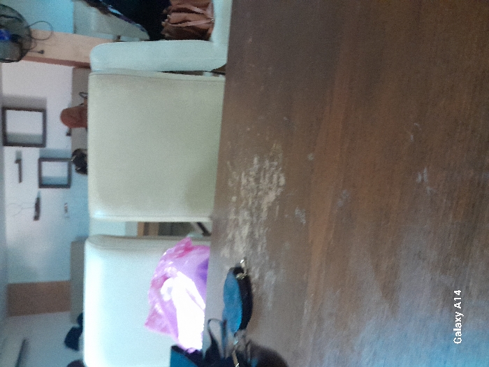 An indoor, vertically-oriented shot displays a brown wooden table surface with a white and beige ottoman-style seat to the left. Various objects, including a plastic bag, keys, and a fan, rest on or near the ottoman. Wall decor is visible in the background to the left. The picture's perspective places the table as a prominent foreground element. The lower right corner bears the "Galaxy A14" watermark.