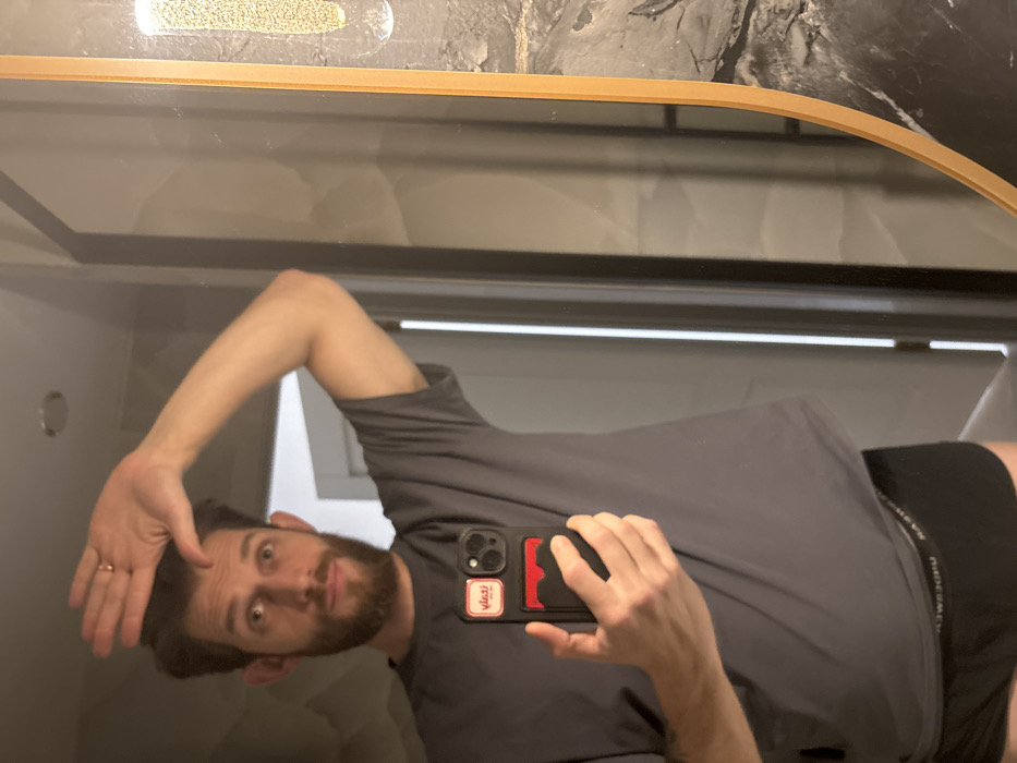 A man is taking a selfie in a bathroom mirror. He's wearing a gray t-shirt and black underwear. His dark hair is short and he has a beard. He is holding a phone with a case featuring red accents. The bathroom has a dark marble countertop and a mirror with a light-colored frame. A light fixture is visible above the mirror. Part of a white door is visible in the background.