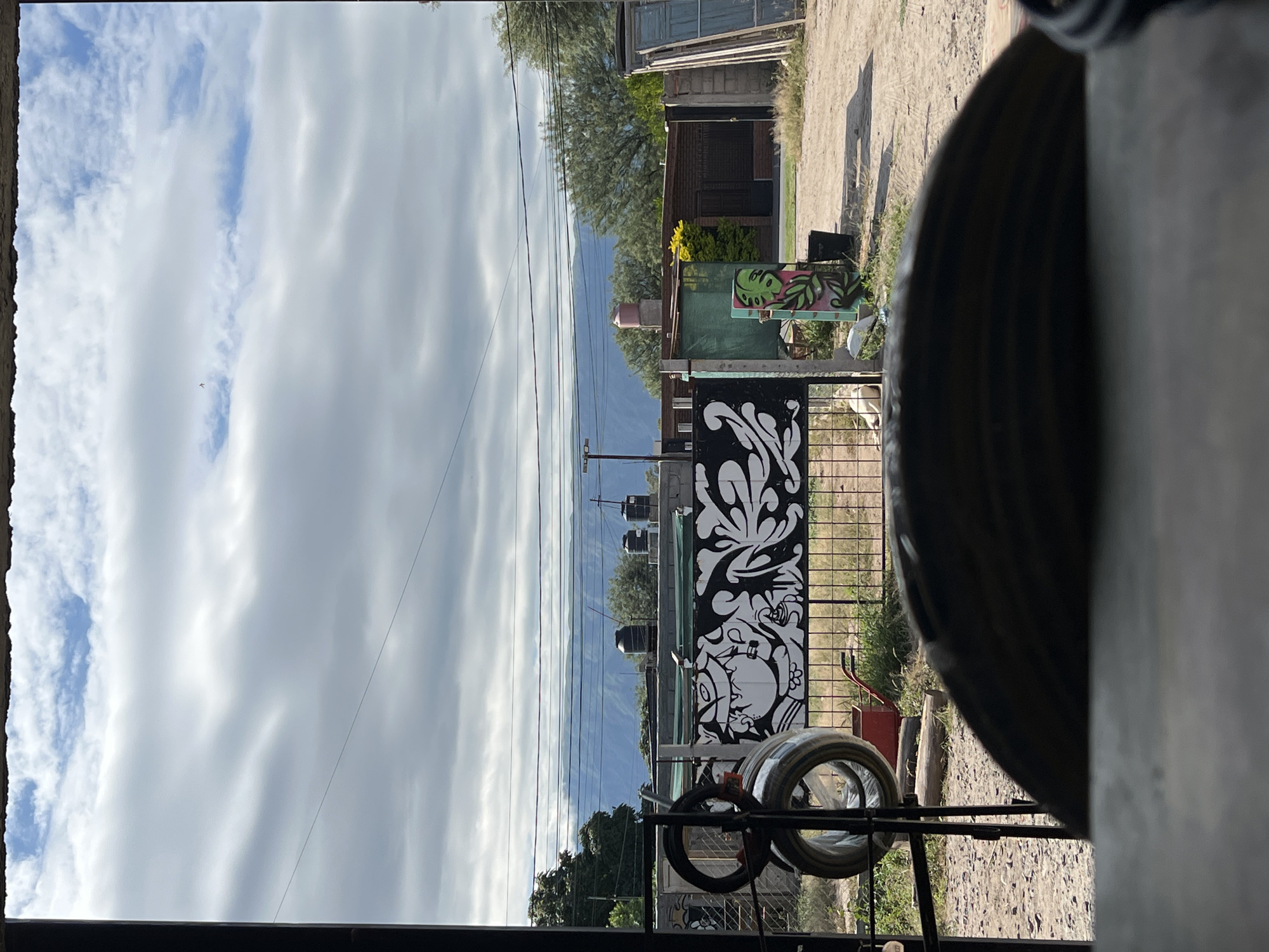 The scene depicts an outdoor view captured from within a structure, likely a doorway or window, in Sumalao, Argentina. The bottom foreground shows a blurred, dark, curved object. Vertical dark structural elements frame the left and right sides of the view. The sky overhead is predominantly overcast with varying shades of grey and white clouds, revealing patches of blue sky in the upper sections. A faint, thin horizontal wire is visible across the sky. In the far background, a hazy blue mountain range extends horizontally beneath the cloud line. The midground features a black metal fence running horizontally. Attached to this fence is a large, rectangular black panel or banner adorned with white graphic art, depicting a stylized face or character on the left and intricate floral or organic patterns across the remainder. To the right of this, a smaller, upright green panel is present, decorated with pink and green leaf motifs. Behind the fence, several objects are visible: * On the left, a metal rack holds multiple coiled items, one wrapped in clear plastic. * A red wheelbarrow with a single front wheel rests on the dirt ground behind the fence. A wooden log is also on the ground nearby. * A small, white, supine animal (possibly a dog) is visible near the left side of the fence. * Further back, various trees and shrubs are scattered, including a light green tree with yellow accents. * Multiple black water tanks are perched on the rooftops of distant, low-lying structures, with one pink water tank also visible. * A brown brick building with dark doors or windows is discernible further into the scene. * Utility poles and multiple overhead power lines traverse the view horizontally. * On the far right, several light-colored wooden panels or doors lean against a concrete block wall. The ground is unpaved, consisting of dirt and gravel, with intermittent patches of dry grass. No human figures or active interactions are observed in the image.