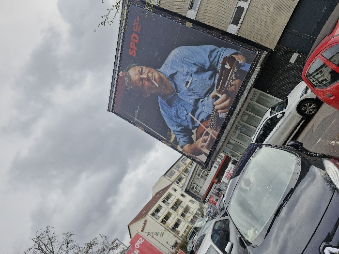The image displays an urban street scene in Frankfurt, Germany, under a heavily overcast sky. A large, angled political advertisement billboard dominates the upper midground. The billboard features a portrait of a middle-aged man with a cigarette in his mouth, dressed in a blue denim shirt, playing an acoustic guitar. Red text "SPD" is visible in the upper right corner of the billboard, accompanied by smaller white text reading "Soziale Politik Für Dich." Below the billboard, a commercial establishment with glass frontage is visible, part of a building with a darker facade to the right. To the left of the billboard, a multi-story building with balconies displays a red sign with "SPD" and partially reversed German text, including "Betriebsrat." In the foreground and midground, multiple cars are parked parallel to a street or parking area. A dark-colored car occupies the immediate foreground, with its hood and windshield visible. A red car is partially seen on the right, and a white SUV is parked behind the dark car. Bare tree branches are present on the far left, with some sparse foliage on the right.
