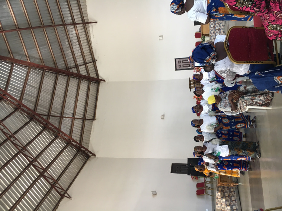 The image depicts an interior scene within a large, brightly lit hall or church in Jos, Nigeria