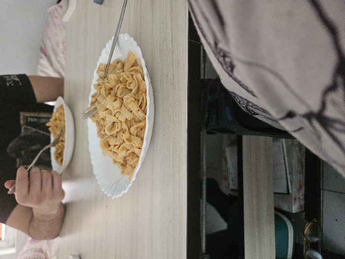 The image captures an indoor scene in Varna, Bulgaria, showing a meal taking place at a light-colored wooden table. In the immediate foreground, a white, scalloped-edge plate holds a portion of tagliatelle-like pasta coated in a light orange sauce, with a silver fork resting within it. Behind this plate, partially obscured, a second individual is visible from the mid-torso up, wearing a dark t-shirt with a faint graphic. This individual's right arm and hand are visible, holding a silver fork and actively eating from a similar white plate of pasta. The upper left background reveals a window with a white frame, providing natural light, and a light-colored patterned textile. The extreme bottom right foreground shows a knee and upper thigh, covered in light-colored patterned fabric, indicating the perspective of the person capturing the image. Beneath the table, a lower shelf or storage area is partially visible, containing a teal-colored container, white boxes, and a pair of spectacles with round lenses.