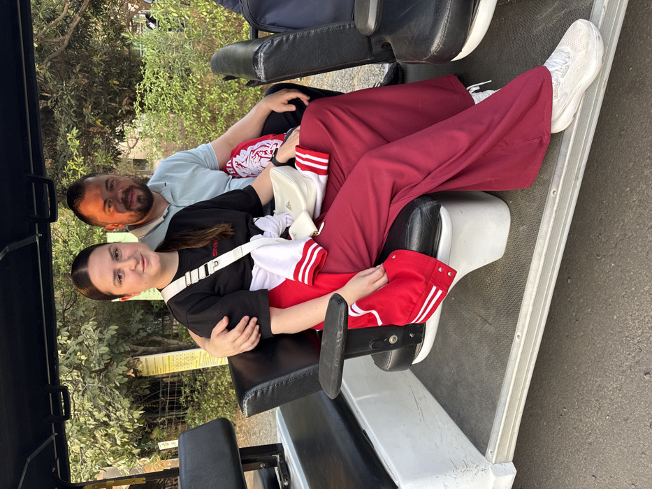 - "The image displays two individuals, a female and a male, seated in a white open-air electric shuttle vehicle with a dark canopy top" by FM-8gHP13, licensed under CC BY 4.0