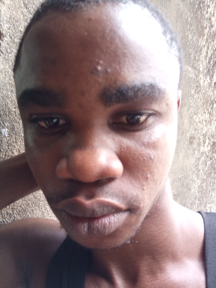 A close-up selfie of a young, dark-skinned man with short hair and thick eyebrows. He has a wide nose and full lips, and his eyes are cast slightly downward. His skin shows some blemishes and is slightly glossy. The background appears to be a textured wall. He is wearing a black tank top or sleeveless shirt, revealing part of his shoulder. His arm is also visible, bent and positioned behind his head.