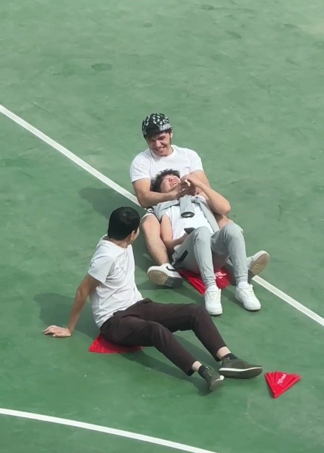 Three young men are sitting on a green court, possibly a tennis or basketball court, with white lines marking boundaries. One man is seated on a red square, with his legs outstretched and leaning slightly back, looking at the other two. Another man is sitting on another red square, with the third man seated in his lap. The man in the lap is holding a phone and smiling. The man behind him is looking at the phone and smiling. They are all wearing casual clothing. The overall impression is one of camaraderie and light-heartedness.
