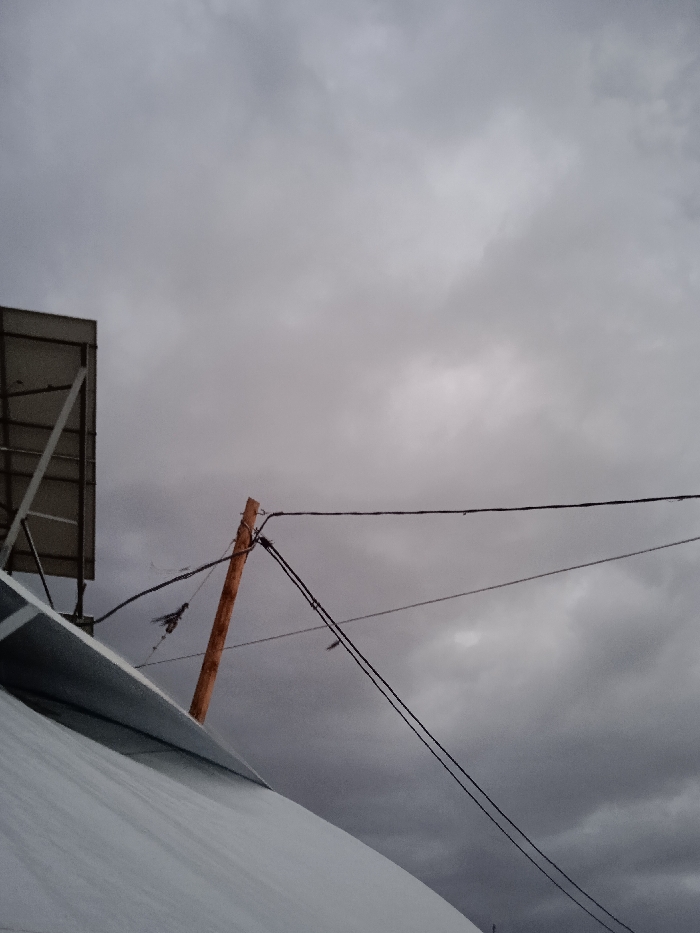 A cloudy sky dominates the view. Beneath, the corner of a solar panel protrudes on the left. A wooden utility pole stands, supporting multiple electrical lines stretching across the frame. The scene appears to be on a rooftop or elevated position, looking upward towards the overcast sky.