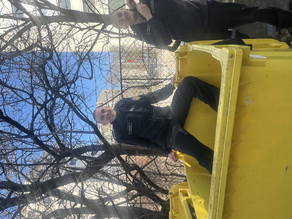 The image displays two adult males in an urban environment. The primary subject, situated inside a large yellow waste dumpster, is a male with a shaven head, wearing a dark uniform jacket with a name patch reading "СТЕФАНОВ" and a Bulgarian flag insignia on the sleeve, along with dark pants. He is smiling and looking directly at the camera. To his right, partially visible, stands a second male, also with a shaven head and a similar dark uniform, smiling and looking towards the camera, with his right hand raised near his head. Two identical yellow waste dumpsters are visible in the foreground. The background consists of bare tree branches against a clear blue sky, a chain-link fence, and multi-story residential or commercial buildings. A Bulgarian flag is discernable in the mid-ground, indicating the location is within Bulgaria. The urban architecture and national flag are consistent with a city like Varna, Bulgaria. The scene is illuminated by bright daylight.