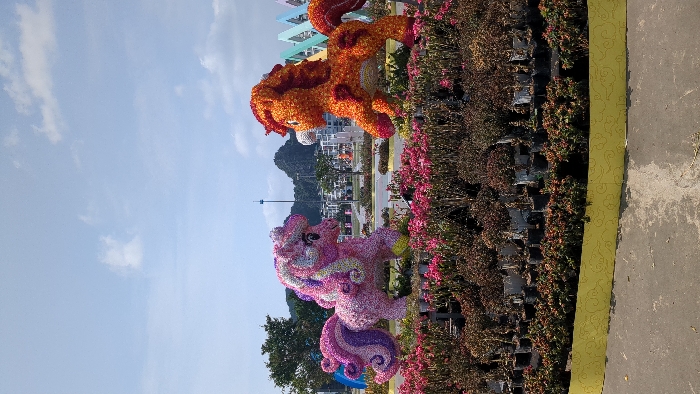 The image displays an outdoor scene in Hong Gai Ward, Vietnam, under bright daylight with a partly cloudy sky. In the immediate foreground, an asphalt surface transitions to a low, curved yellow barrier decorated with dark, wavy patterns. Behind this barrier, a dense arrangement of potted plants is visible, featuring various foliage colors, including reddish-brown, and some plants with pink blossoms, contained in black plastic bags and silver buckets. The central subjects are two large, stylized pony figures constructed from floral arrangements. The left pony is predominantly pink and purple with white and yellow accents, facing right. The right pony is mainly orange and red with white details, positioned facing left towards the pink pony. In the midground, behind the floral ponies, a paved area is visible, with trees and modern buildings in the distance. The background is dominated by a range of karstic limestone mountains under a light blue sky. A tall, slender pole and a multi-colored geometric structure are also discernible in the background. No individuals are present.