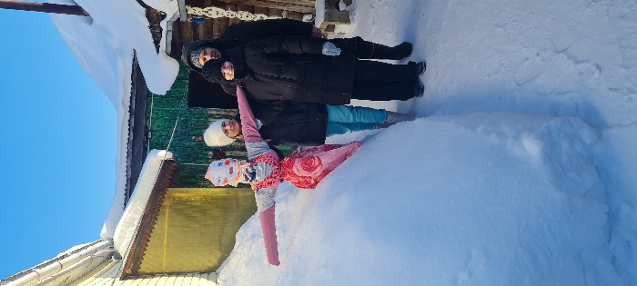 This image captures a snowy outdoor scene in Rusalevka, Russia, under a clear blue sky