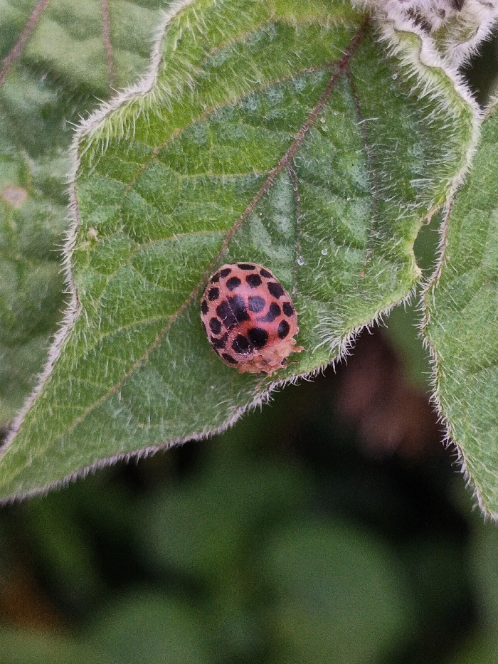 - "A macro photograph shows a reddish-orange ladybug with numerous irregularly shaped black spots on its elytra, positioned on a green leaf" by FM-B2GCN2, licensed under CC BY 4.0