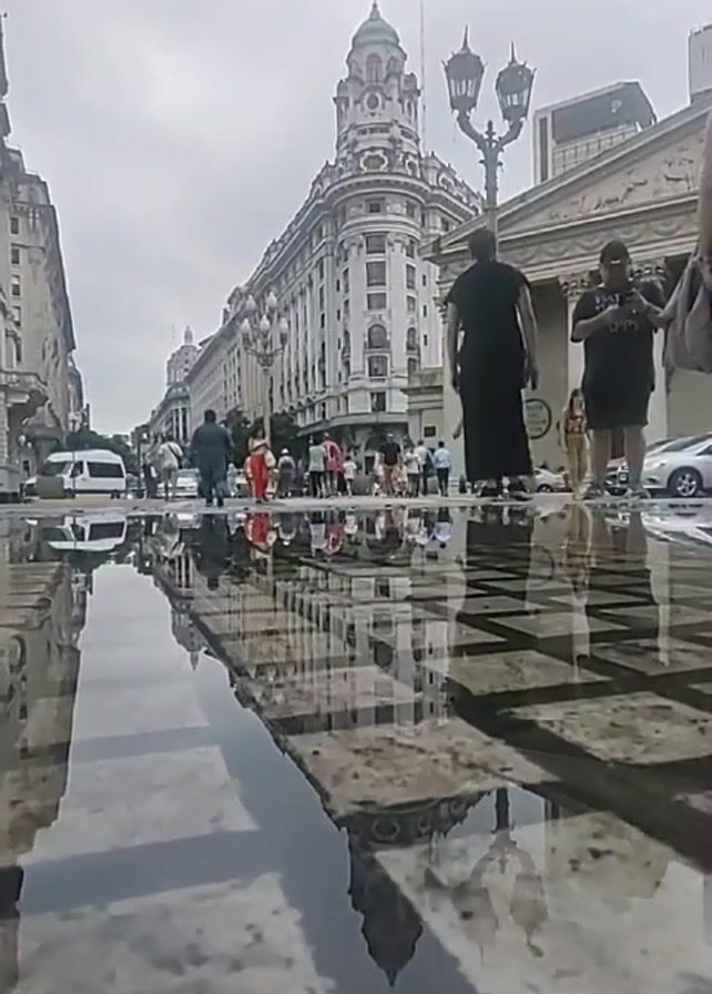 The video showcases a street scene on a cloudy day, reflected in a large puddle on the cobblestone street