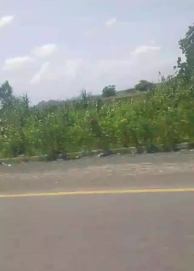 view from a moving vehicle driving on a paved road with a yellow line. The background features green vegetation, some trees, and a distant mountain range under a partly cloudy sky. The vegetation appears to be a mix of shrubs and taller plants, possibly crops. A utility pole is visible near the roadside. The camera appears to be positioned inside a vehicle, capturing the passing landscape.