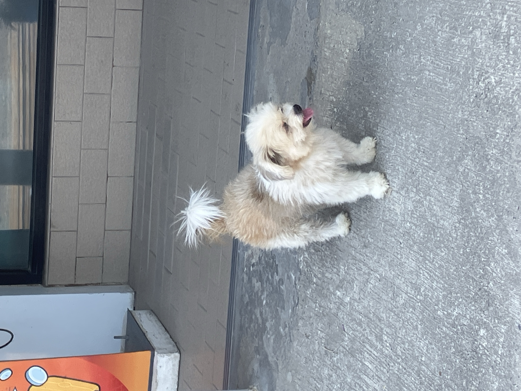 - "The scene depicts a small, shaggy-coated dog standing on a grey, textured concrete surface in Baan Plai Laem, Thailand" by FM-iSxzL2, licensed under CC BY 4.0