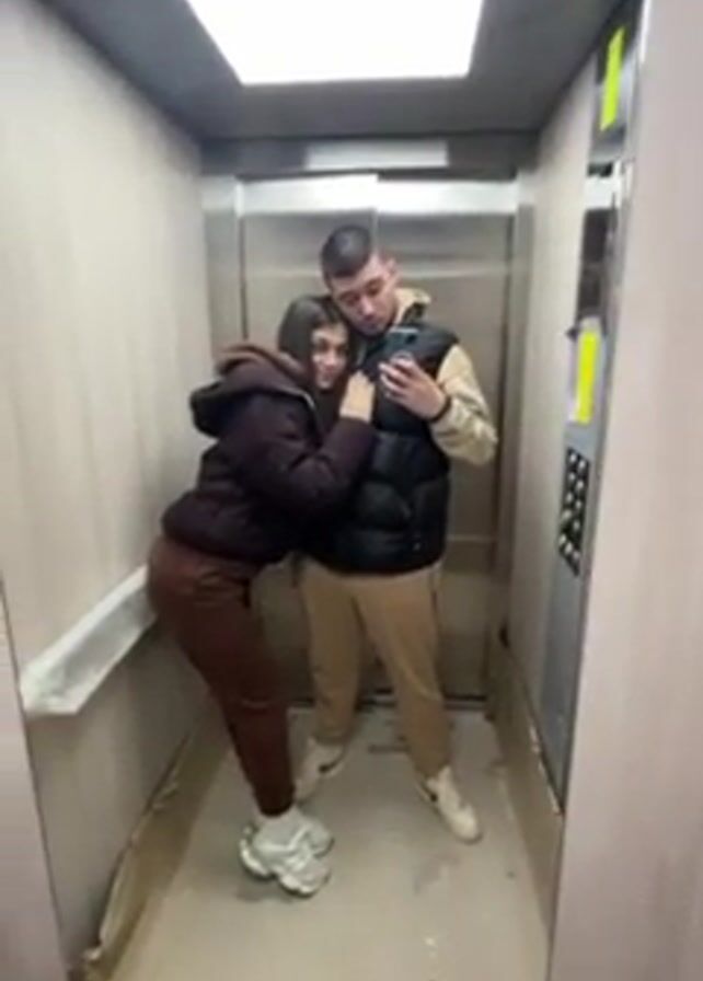 A young woman and man are inside an elevator. The woman is wearing a brown puffer jacket and brown pants with white shoes. She leans against the wall of the elevator, hugging the man and resting her head on his shoulder. The man wears a black puffer vest over a beige hoodie, beige pants, and white shoes. He holds a smartphone and is taking a selfie. The elevator interior is simple, with paneled walls and a mirror on one side. There is a square light fixture on the ceiling. Cardboard and protective covering is seen along the bottom edge of the walls. Elevator buttons are visible on the right.