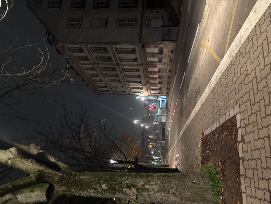 A nighttime street scene features a tall building lining the left side of the road. Bare trees frame the sky and building. The street is marked with yellow lines and bordered by a cobblestone sidewalk. Streetlights illuminate the scene, highlighting a distant intersection with a red traffic light. The foreground displays a grassy area alongside the sidewalk.