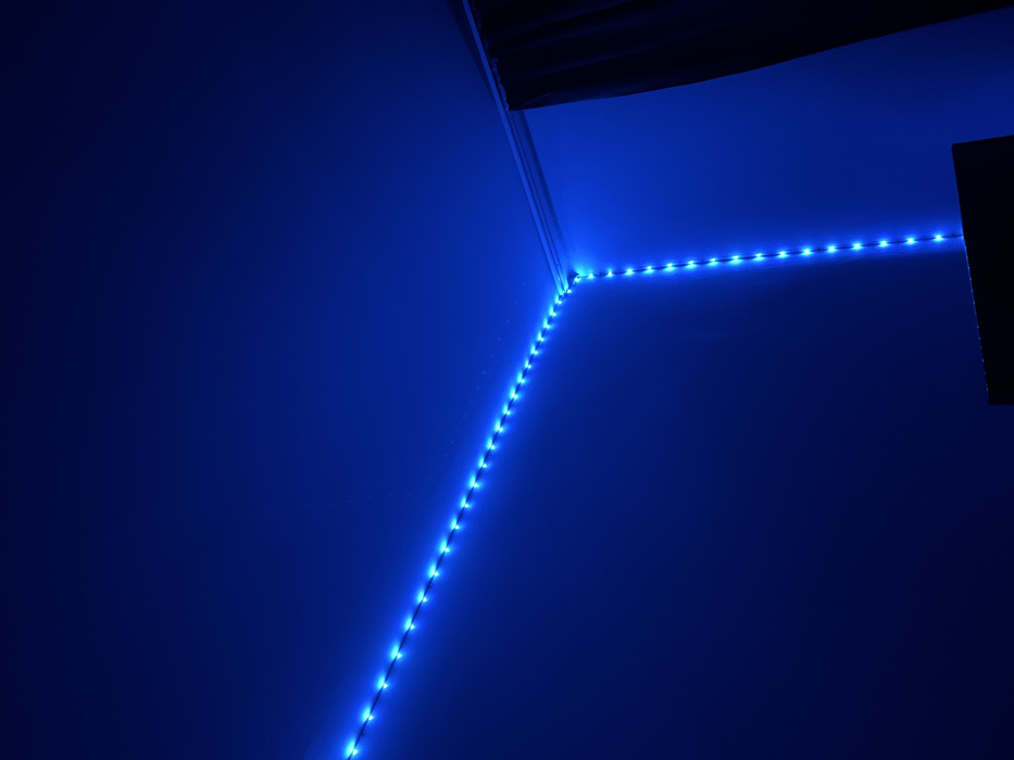 An interior room in Karlovo, Bulgaria, is depicted under artificial blue light. A continuous string of individual blue LED lights is affixed to the wall, extending diagonally from the upper-left corner of the frame towards the upper-right corner, then making a sharp 90-degree turn to descend vertically along the right wall. Each LED emits a distinct blue illumination, casting a uniform deep blue tint across the visible wall and ceiling surfaces. A white ceiling molding is discernible along the top right edge, appearing blue due to the lighting. A dark, vertical curtain or drape is present along the far right side of the frame. The top edge of an unidentified dark, rectangular object is partially visible at the bottom center of the image. No individuals, overt actions, or interactions are depicted.