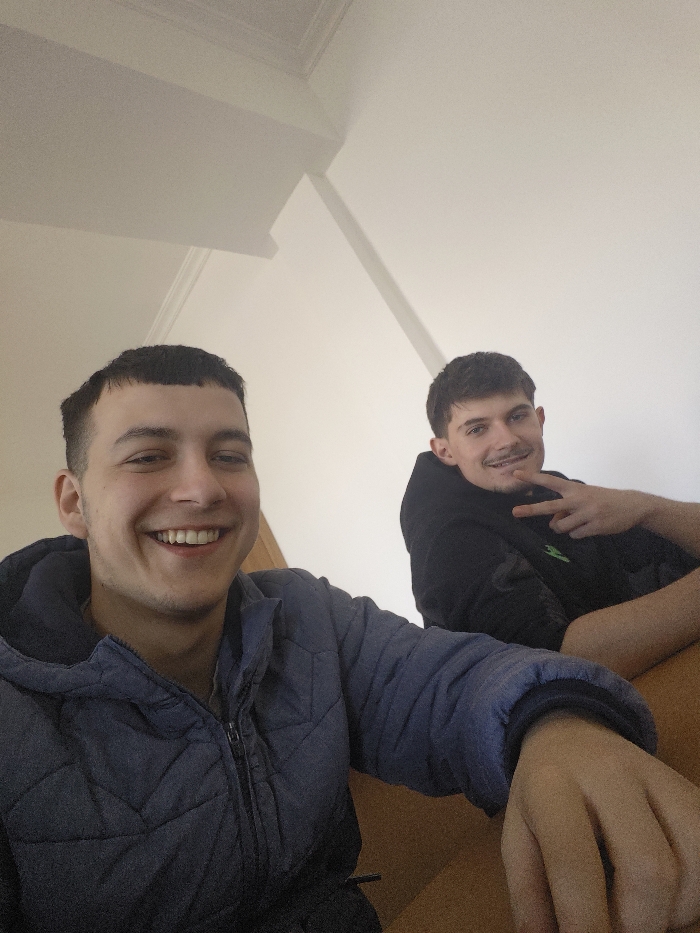 The image displays two young adult males in an indoor setting. The subject in the foreground on the left has short dark hair, fair skin, and is smiling with visible teeth. He wears a dark blue quilted jacket with a front zipper. His right hand is partially visible in the lower right of the frame. The second subject, positioned behind and to the right, also has short dark hair, fair skin, a light mustache, and is smiling. He is making a V-sign with his right hand. This subject wears a black hooded sweatshirt featuring a small green logo on the left chest. The background consists of a plain white ceiling and upper walls, with a visible white architectural molding along the ceiling edge. A blurred, light brown surface, consistent with wood or furniture, is present in the lower right. The lighting is bright and even. No discernible features within the image indicate a specific location in the city of Sofia, Bulgaria.