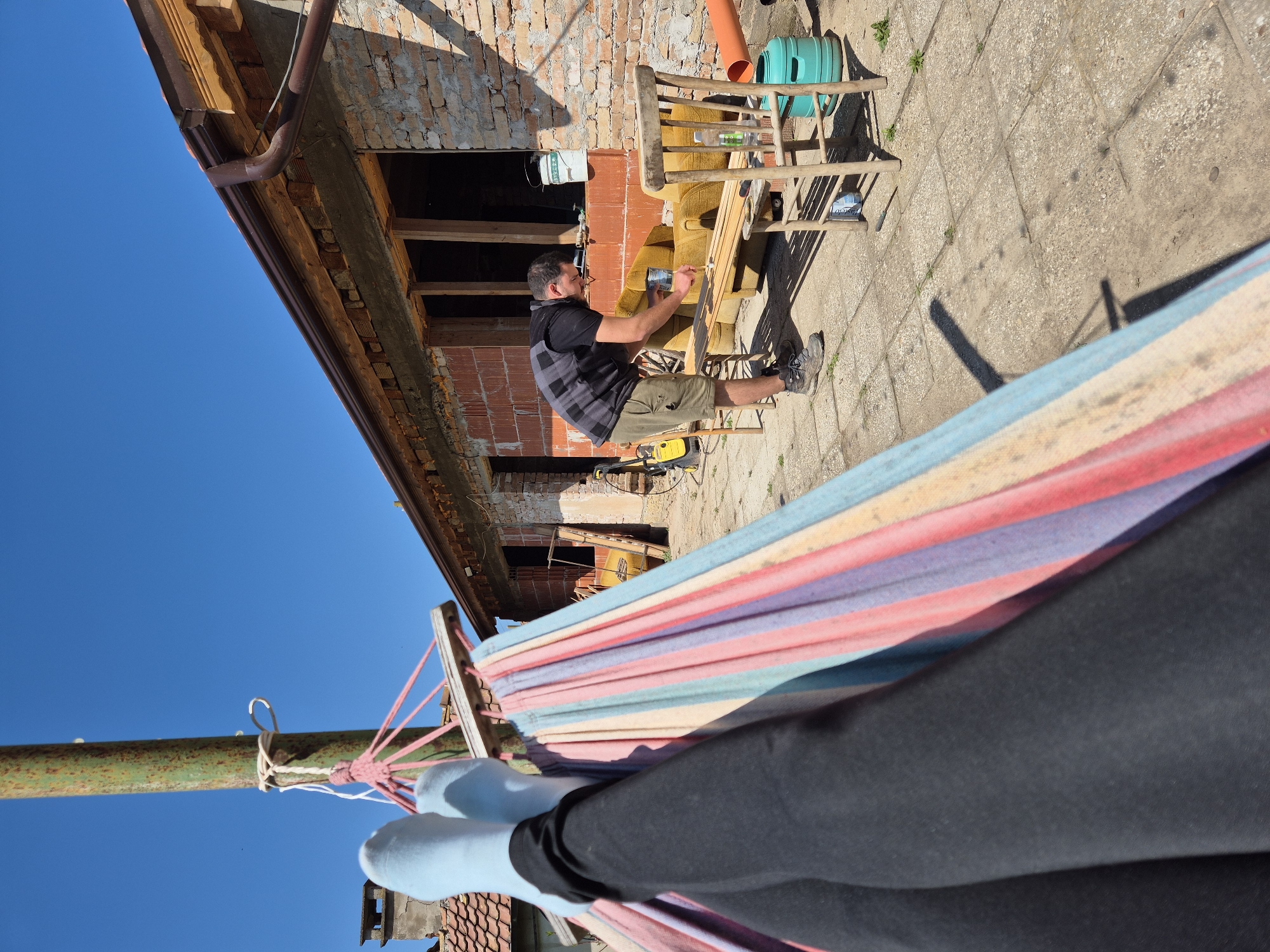 scene in Staroseltsi, Bulgaria. A man is sanding furniture in front of a brick building with open windows. Beside him is a yellow chair filled with cans and other supplies. An orange pipe leans against the building. A pressure washer is on the ground next to the man. In the foreground, a person is lying in a colorful hammock, visible from the legs downwards. They are wearing gray pants and light blue socks. The hammock is tied to a rusty green pole against a clear blue sky.