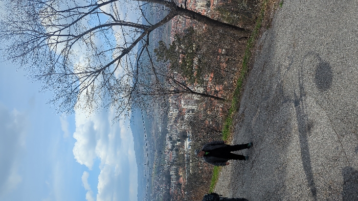 The image depicts an elevated outdoor scene overlooking the city of Kyustendil, Bulgaria, likely from a hillside vantage point. A paved path, appearing to be asphalt or gravel, slopes downwards from the right foreground towards the left. On this path, an adult male stands in the mid-left, facing generally leftward. He is dressed in a dark jacket, dark trousers, and dark athletic shoes with light green or yellow accents. A portion of another dark object or individual is visible on the extreme left edge of the frame. The midground is dominated by several bare deciduous trees with extensive branch networks, indicating a late winter or early spring season, along with one evergreen conifer tree. Beyond these trees, a panoramic view of Kyustendil unfolds, featuring numerous multi-story residential and commercial buildings with light-colored facades and predominantly reddish-brown roofs, spread across the valley. Utility lines or cables are visible stretching horizontally across the cityscape in the distance. The background consists of rolling hills under a partly cloudy sky with patches of blue. Shadows from unseen objects or individuals are cast upon the paved path.