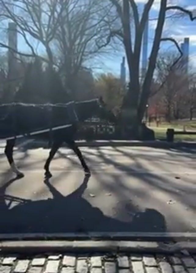A horse-drawn carriage moves across a road, from right to left, in front of a stone barrier. The horse is dark-colored, wearing a harness with metal fittings. The carriage is white, with spoked wheels and a person visible in the driver’s seat. The road surface is gray and reflective in the sunlight, showing the shadows of trees and the carriage. The road is bordered by a cobblestone edge. In the background, there are bare trees, a green park area, and buildings including skyscrapers and a flag waving on a pole. The sky is blue with some clouds. The sun is high in the sky, shining brightly.