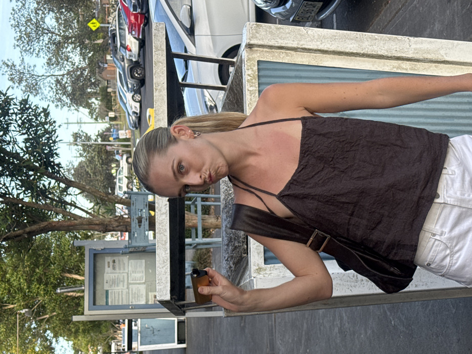 A fair-skinned woman with blonde hair pulled back in a ponytail stands outside, near a road with parked cars. She wears a dark brown tank top with spaghetti straps, white pants, and a dark shoulder bag. She holds a small, brown object in her hand and makes a pouting face at the camera. The background includes trees, street signs, and a concrete structure with a sign.
