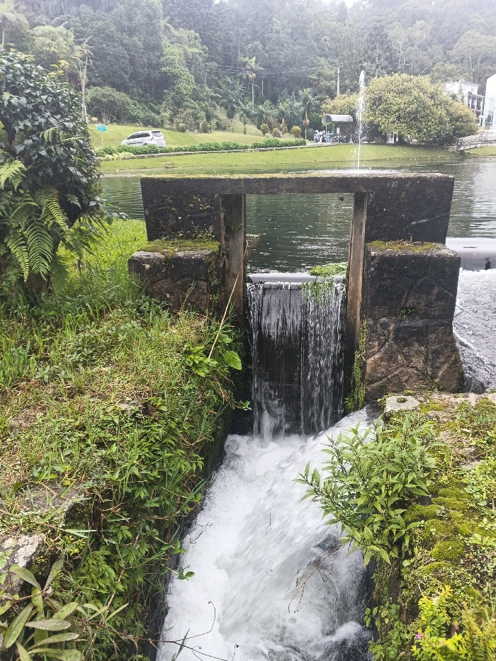 This image depicts a man-made water channel and a larger body of water within a landscaped environment, likely in Matopos, Zimbabwe. In the foreground, a narrow, moss-covered concrete channel features rapidly flowing, turbulent white water. This channel originates from a small, dark grey concrete weir structure, approximately one meter wide, where water cascades over a lip, forming a miniature waterfall. The weir is topped by a horizontal concrete beam supported by two vertical concrete posts, creating an arch-like opening. Surrounding the channel and structure is dense, vibrant green vegetation, including grass, ferns, and various leafy plants, indicating a lush, possibly damp, environment. Beyond the weir, a calm, dark green body of water, likely a lake or large pond, extends into the midground. On the far bank of this water body, a well-maintained green lawn is visible. A white water fountain is actively spraying vertically from the lake's surface on the right side. To the left of the fountain, a light-colored SUV or minivan is parked on or near a paved area bordering the lawn. Further right, a small group of several individuals is gathered under a light-colored, possibly white, covered structure, which may be a gazebo or shelter. A multi-story white building with architectural details is situated behind these individuals and trees on the far bank, and a small bridge spans a section of water to the building's right. The background features dense, verdant forested hills under an overcast sky, suggesting an outdoor, possibly humid, setting.