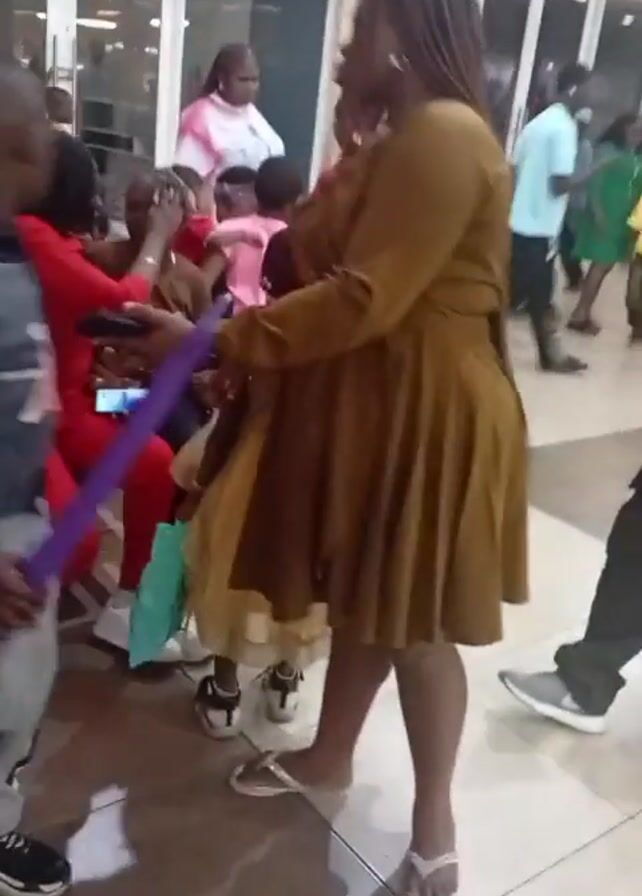 n indoor scene, possibly a shopping mall or public space, with multiple people present. A woman with long, braided hair, wearing a brown dress and silver sandals, stands with her arms crossed. A young boy in a gray tracksuit is standing near her. The camera shifts perspective, showing more people passing by in the background, including a person in a pink shirt and others in casual clothing. The floor is tiled, and there are large glass windows or doors in the background.