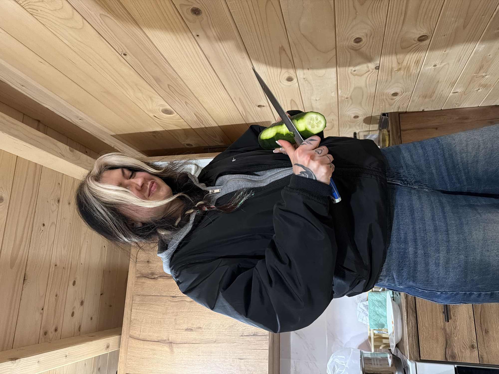A woman with blonde-streaked dark hair is cutting a cucumber with a knife. She is wearing a black jacket over a gray hooded sweatshirt and blue jeans. The background features a wooden ceiling and what appears to be a kitchen counter. The location is unknown, and there is no information that indicates this image was taken in Gusinje, Montenegro.